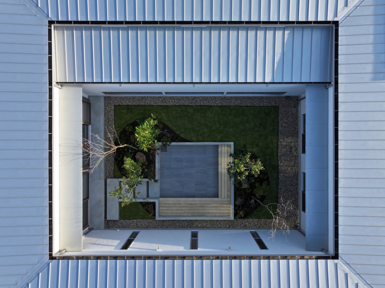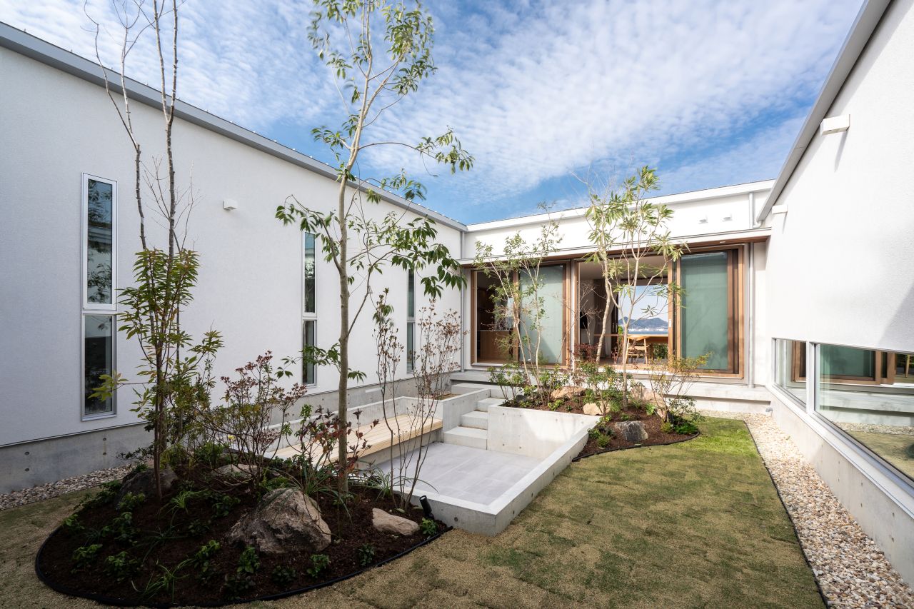 家の中心には、ベンチや木々が配された中庭があります。ダイニングキッチンや廊下など、家の中の様々な場所からいつでも中庭の緑を眺めることができ、四季の移り変わりを身近に感じながら暮らすことができます。自然の光と風が家全体に行き渡る、快適で開放的な住まいです。